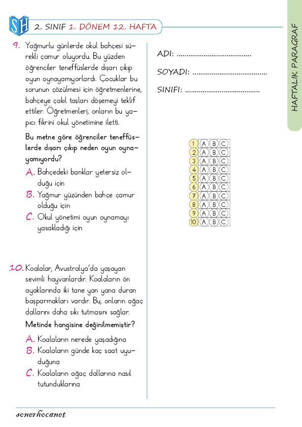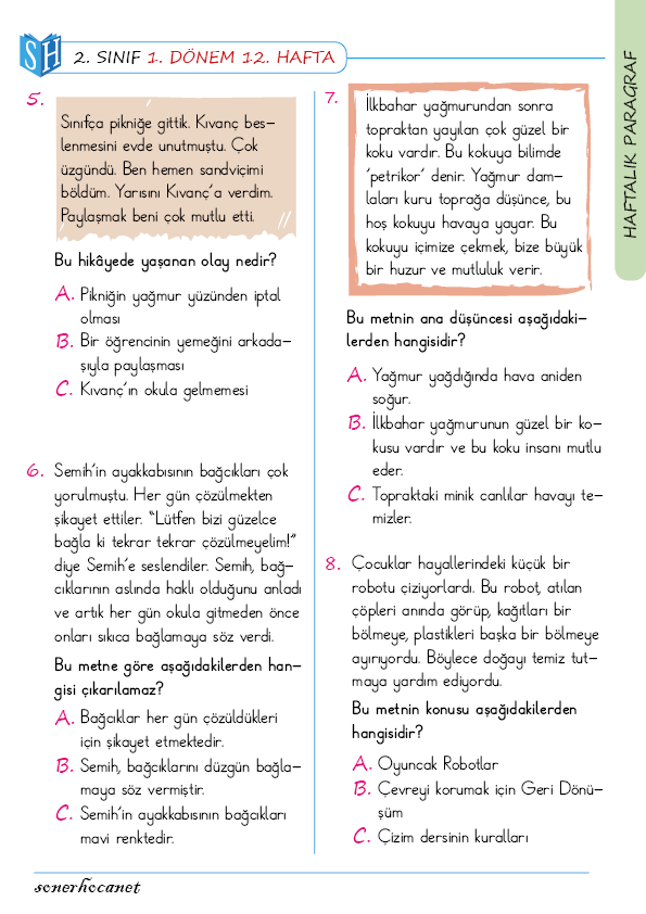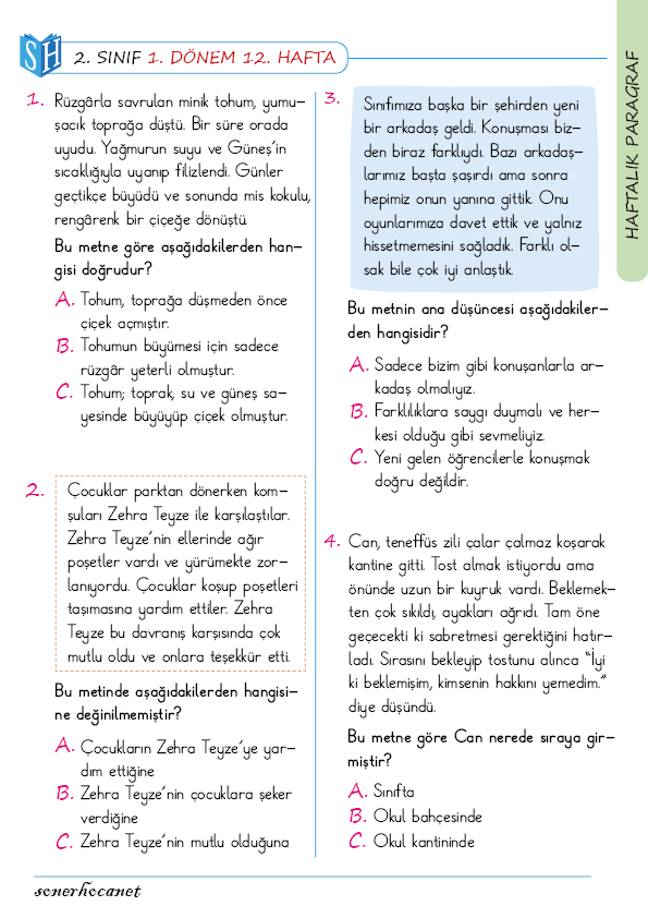 Diğer yandan, düzenli olarak paylaştığımız 2. sınıf haftalık paragraf testleri, öğrencinin sadece Türkçe dersindeki başarısını değil, tüm akademik hayatını olumlu etkiler. Çünkü okuduğunu anlama becerisi, matematik problemlerini çözmenin de temelidir. Uzmanlar çocukların günde en az 20 dakika okuma yapmasını önermektedir.