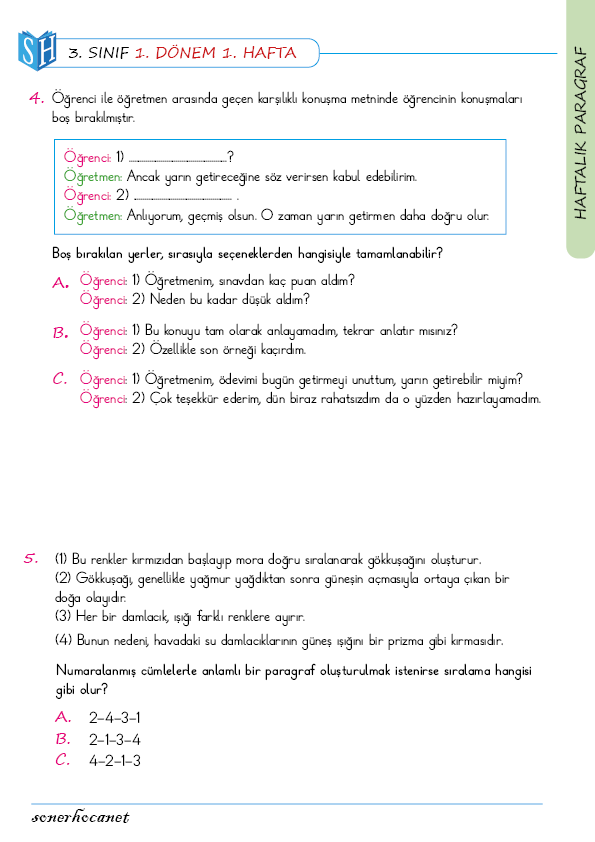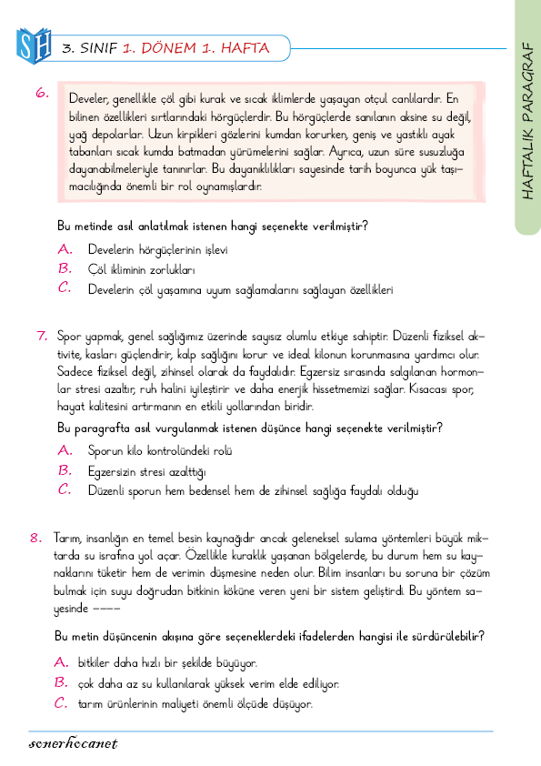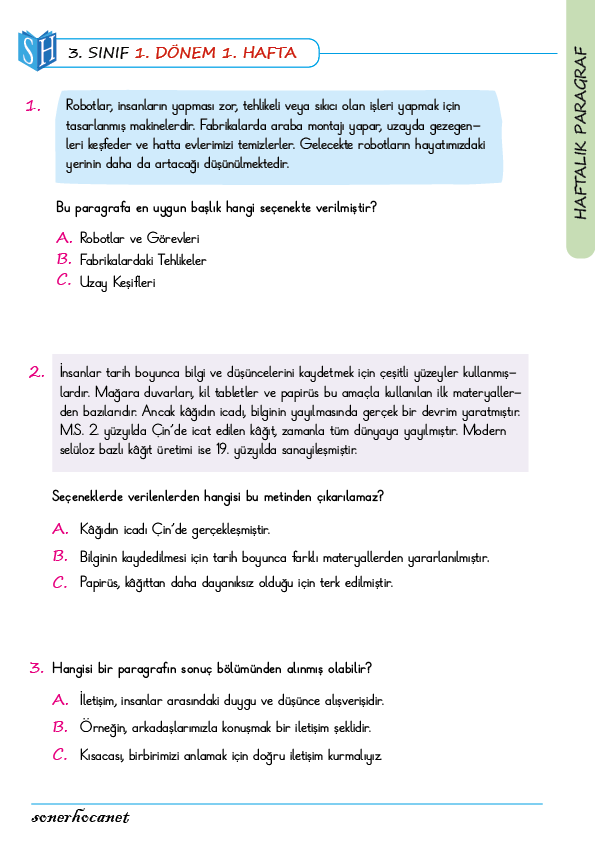 Diğer yandan, düzenli olarak paylaştığımız 3. sınıf haftalık paragraf testleri, öğrencinin sadece Türkçe dersindeki başarısını değil, tüm akademik hayatını olumlu etkiler. Çünkü okuduğunu anlama becerisi, matematik problemlerini çözmenin de temelidir. Uzmanlar çocukların günde en az 20 dakika okuma yapmasını önermektedir.