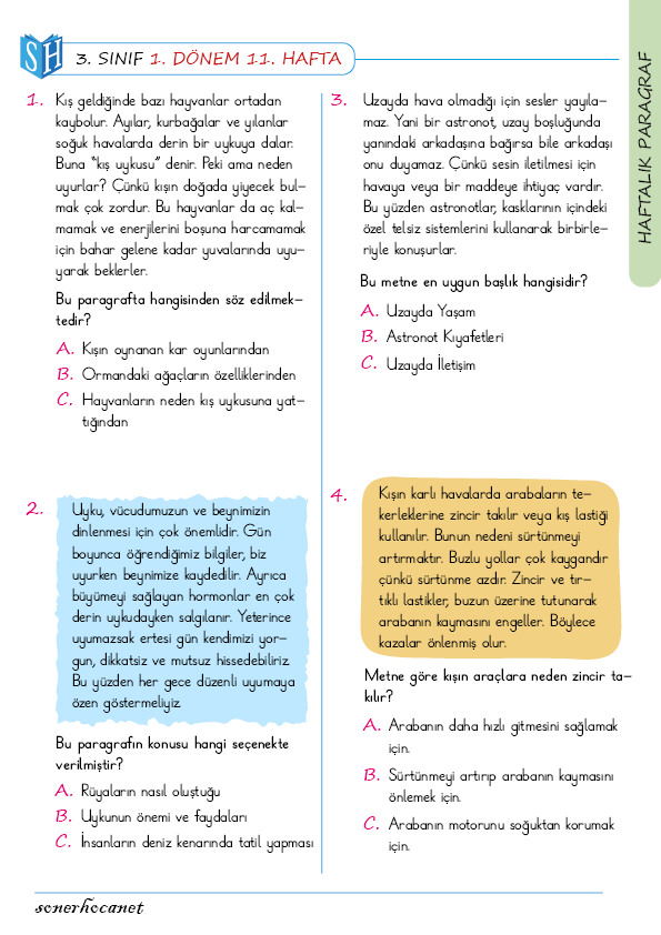 3. Sınıf Haftalık Paragraf (1. Dönem 11. Hafta) – PDF İndir