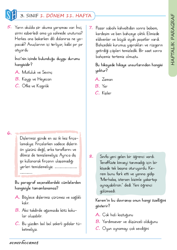 3. Sınıf Haftalık Paragraf Çalışmasının İçeriği