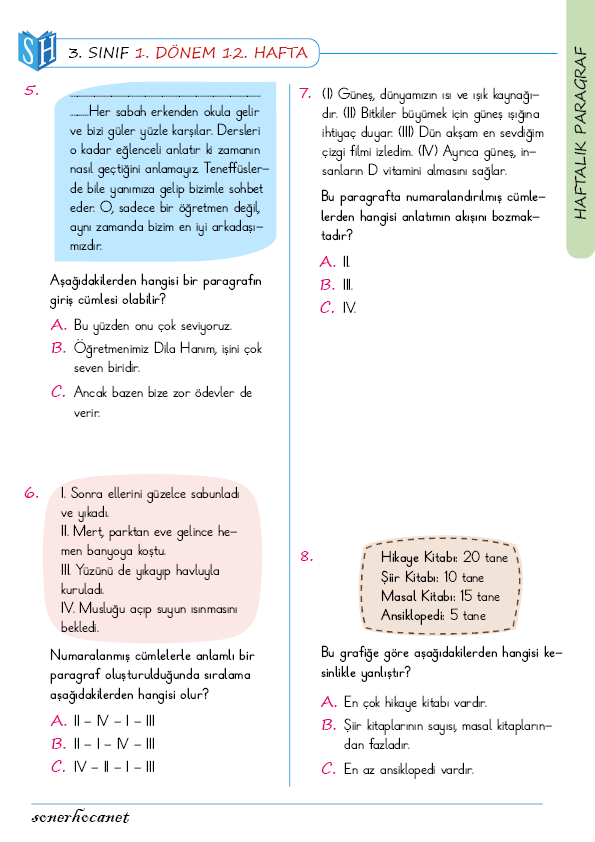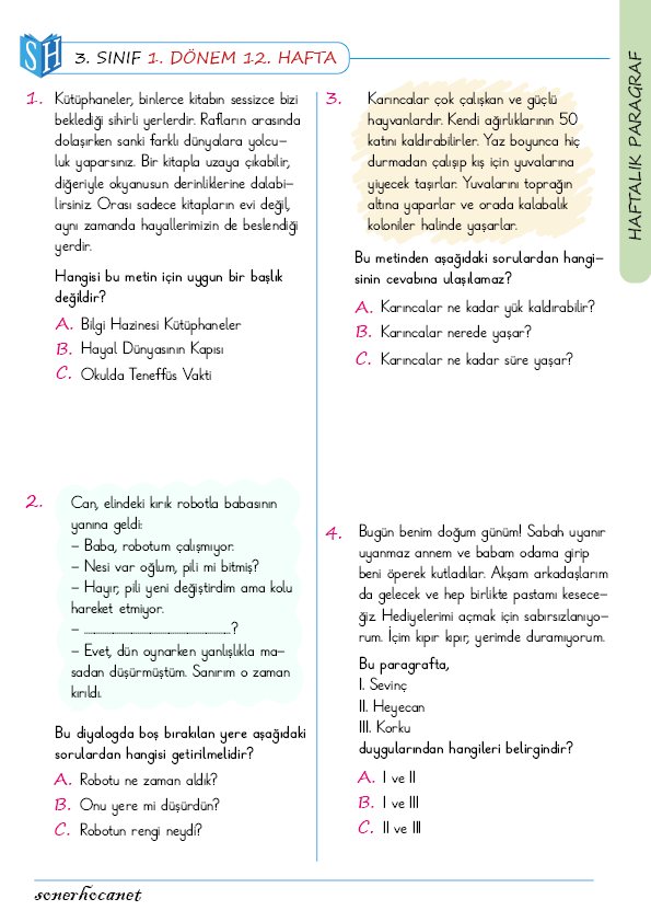 Diğer yandan, düzenli olarak paylaştığımız 3. sınıf haftalık paragraf testleri, öğrencinin sadece Türkçe dersindeki başarısını değil, tüm akademik hayatını olumlu etkiler. Çünkü okuduğunu anlama becerisi, matematik problemlerini çözmenin de temelidir. Uzmanlar çocukların günde en az 20 dakika okuma yapmasını önermektedir.