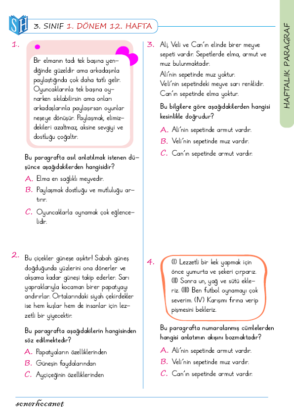 3. Sınıf Haftalık Paragraf Çalışmasının İçeriği