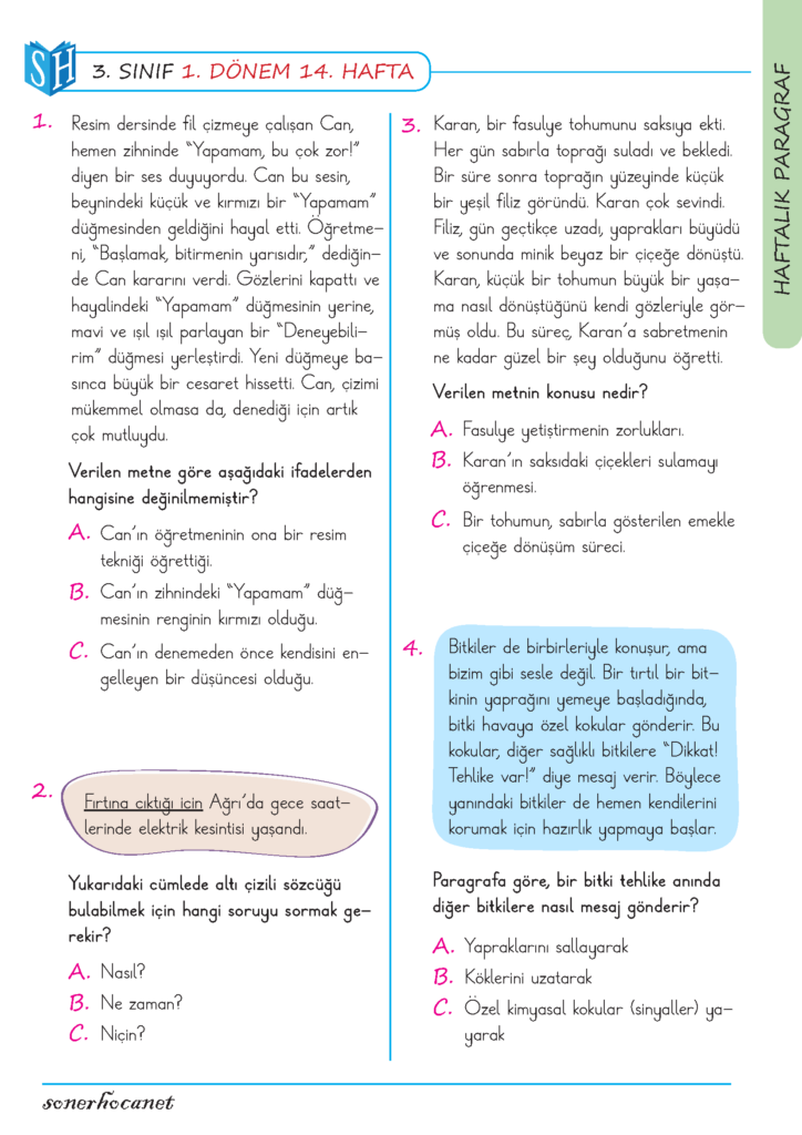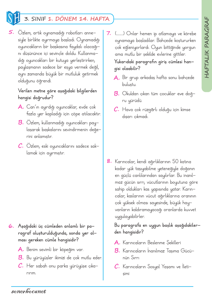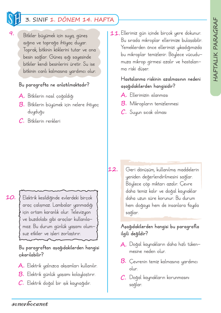 Diğer yandan, düzenli olarak paylaştığımız 3. sınıf haftalık paragraf testleri, öğrencinin sadece Türkçe dersindeki başarısını değil, tüm akademik hayatını olumlu etkiler. Çünkü okuduğunu anlama becerisi, matematik problemlerini çözmenin de temelidir. Uzmanlar çocukların günde en az 20 dakika okuma yapmasını önermektedir.