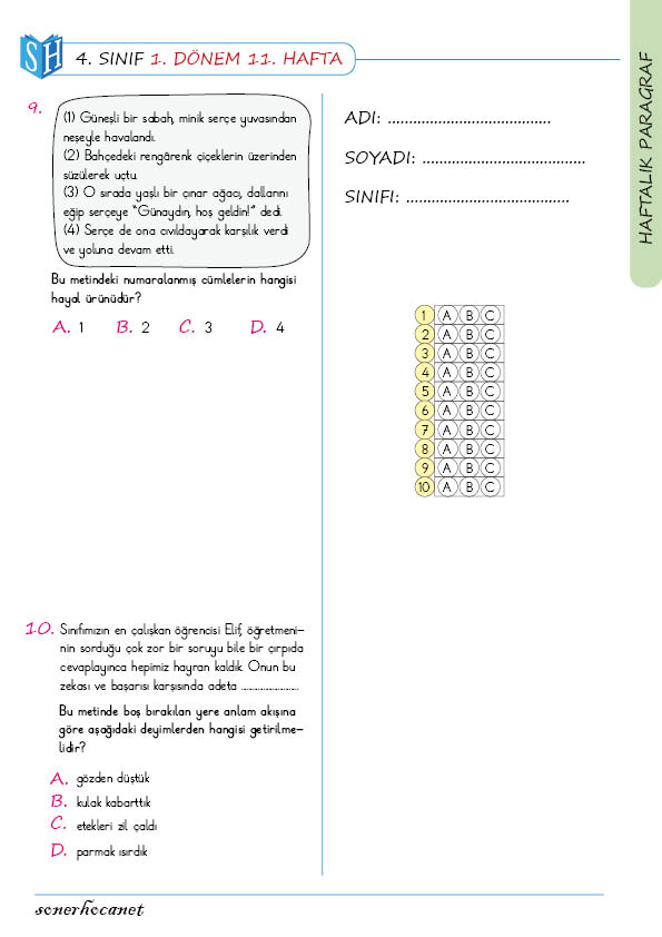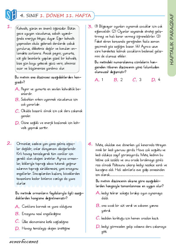 4. Sınıf Haftalık Paragraf Çalışmasının İçeriği